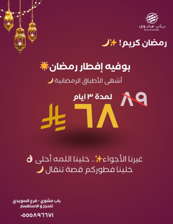 بوفيه مقابل 99 ريالًا سعوديًا، مع عرض خاص حتى اليوم السابع من رمضان.