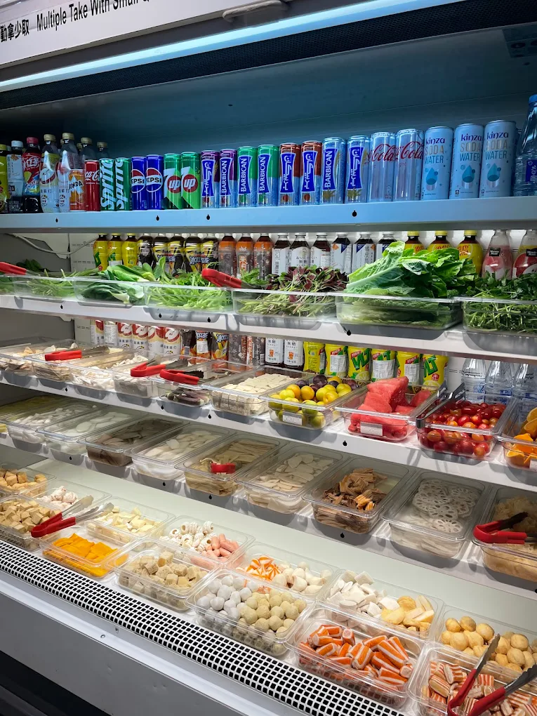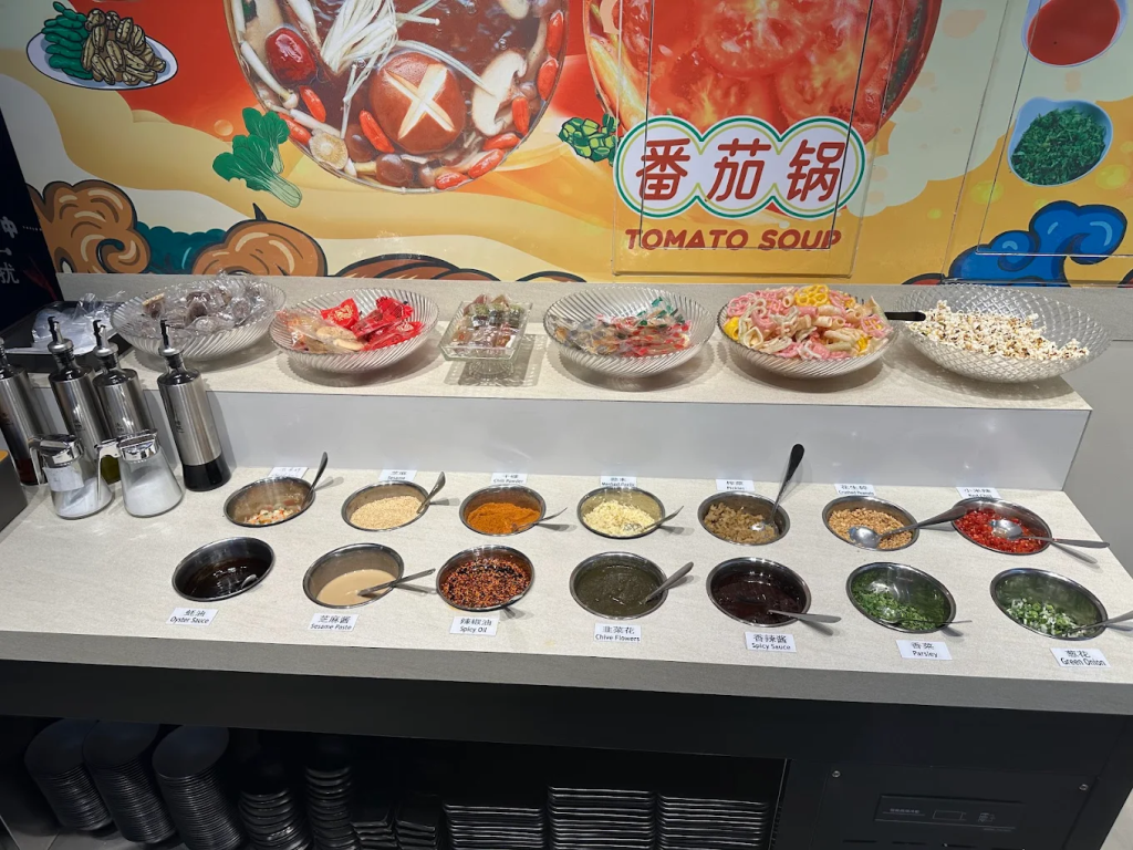 بعدها تنتقل إلى بوفيه المكونات الذي يضم أكثر من 70 صنفًا من الخضار، اللحوم، الدجاج، المأكولات البحرية، النودلز، والتوفو، بالإضافة إلى مجموعة واسعة من الصلصات. من أبرز الأشياء هنا وجود خيارات بحرية مثل الروبيان والمحار، مما يعطي التجربة طابعًا مختلفًا ومميزًا. يمكنك اختيار مشاركة قدر كبير مع مجموعتك أو طلب قدر خاص لك.